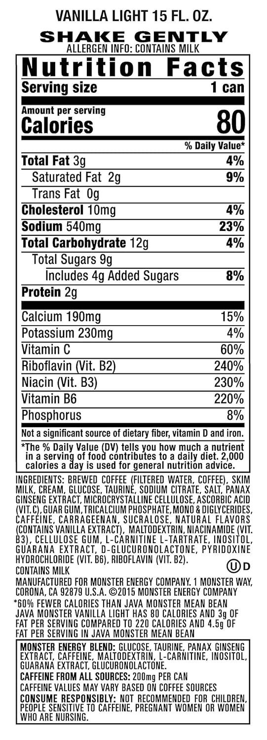 No foam, extra hot, half-caf, no-whip, soy latte, enough of the coffeehouse bs already. It’s time to get out of the line and step up to what’s next. Java Monster, premium coffee and cream brewed up with killer flavor, supercharged with Monster Energy blend. Coffee done the monster way, wide open, with a take no prisoners attitude and the experience and know-how to back it up. Consumer responsibility–limit 3 cans per day. Not recommended for children, pregnant women or people sensitive to caffeine. Instructions: Shake gently.